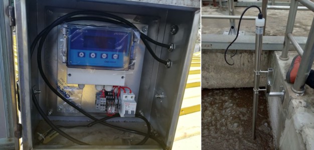 在污水進、出口均設有pH分析儀,進水處配置pH計的目的是方便工藝人員針對進水水質采取相應的控制調節(jié)手段,以滿足后續(xù)處理的要求。在出水處設置pH計的目的是反映處理的效果,方便廠部和政府部門對污水廠運行狀態(tài)監(jiān)管。pH計的基本工作原理是用電位法測量溶液的酸堿度,插人待測溶液的測量電極與具有恒定電位的參比電極之間的電勢差與溶液pH值之間有固定的函數(shù)關系,由此通過測量電勢得出pH值。